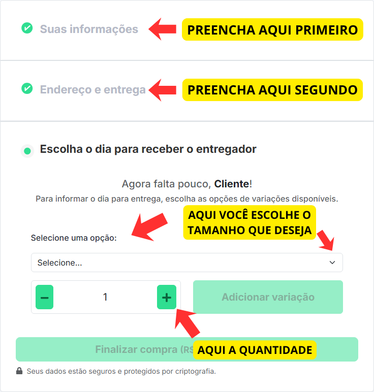 Na aba para agendar o dia da entrega, você terá a opção de escolher o tamanho desejado.